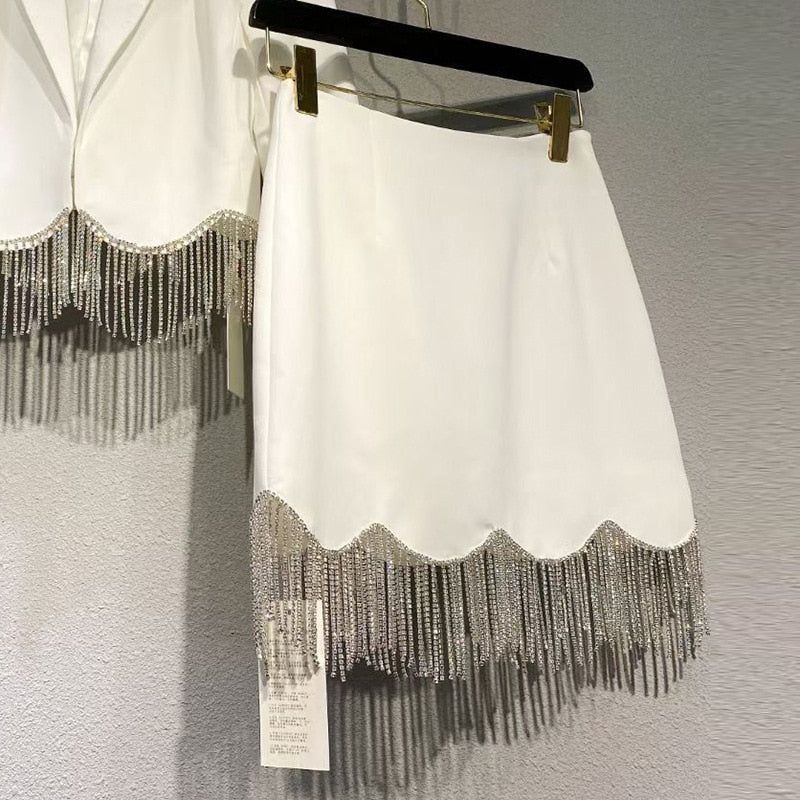 New Women's Suit Sexy Lapel Long Sleeve Diamond Tassel Short Jacket & Mini Skirt Diamond Tassel Two Piece Set